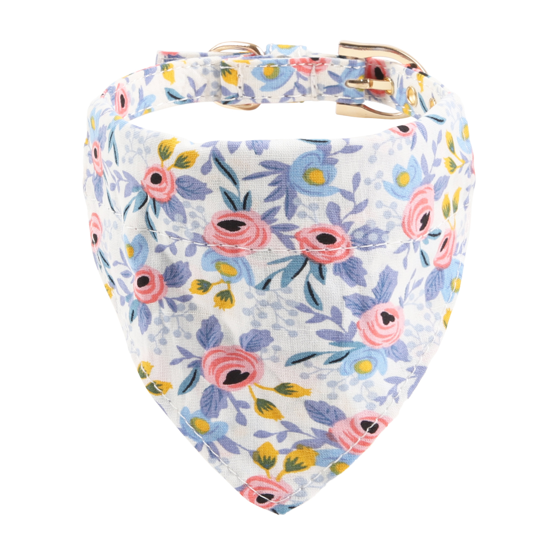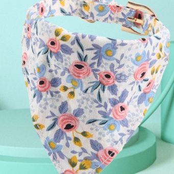 愛らしい花柄が全面にあしらわれた犬首輪とバンダナが一体化したおしゃれなアイテムです。