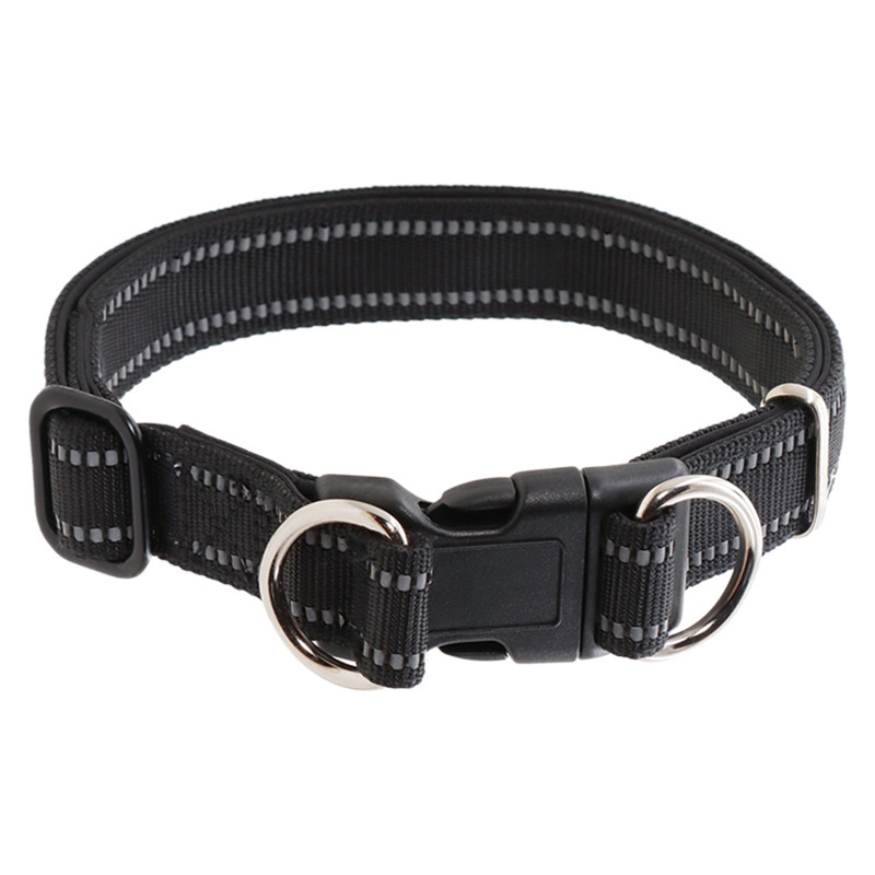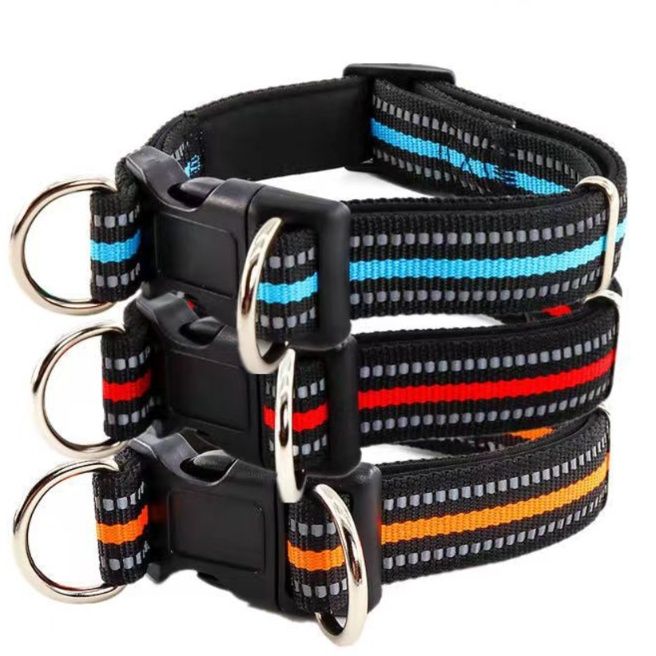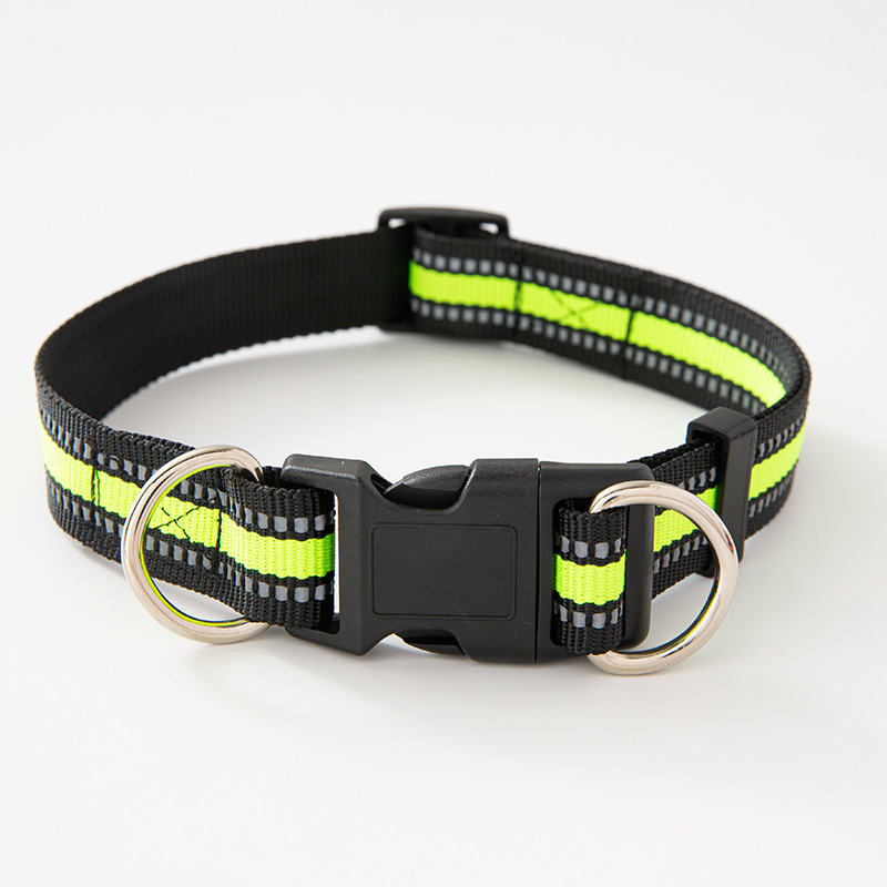 夜間の散歩も安心な光る反射材を織り込んだ犬首輪です。