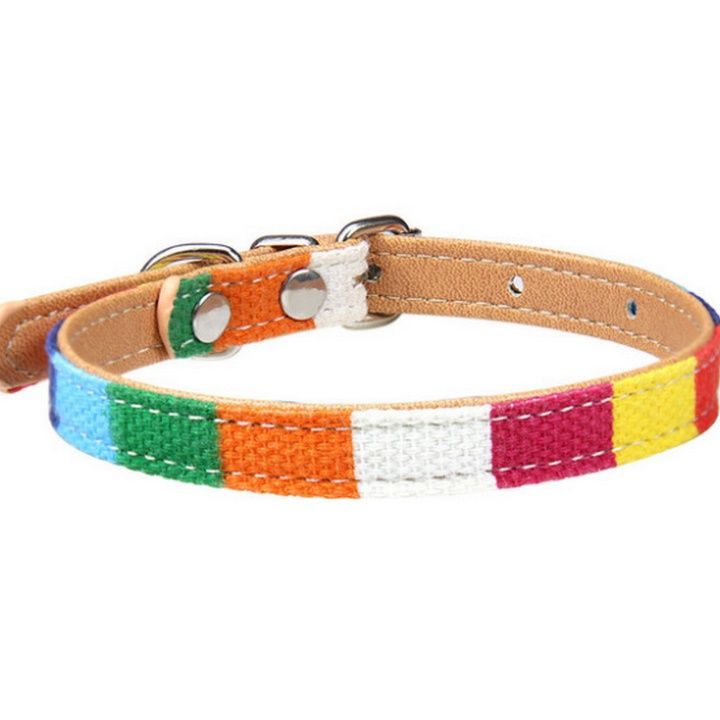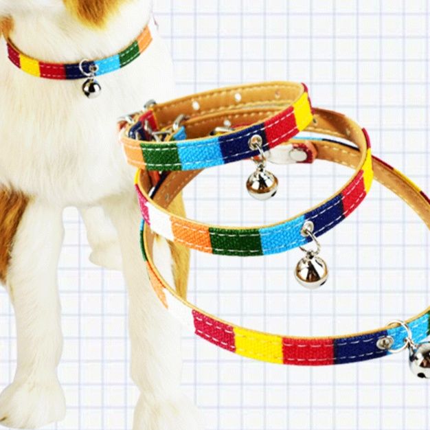 愛犬の毎日を明るく彩る虹色ストライプデザインの犬首輪です。