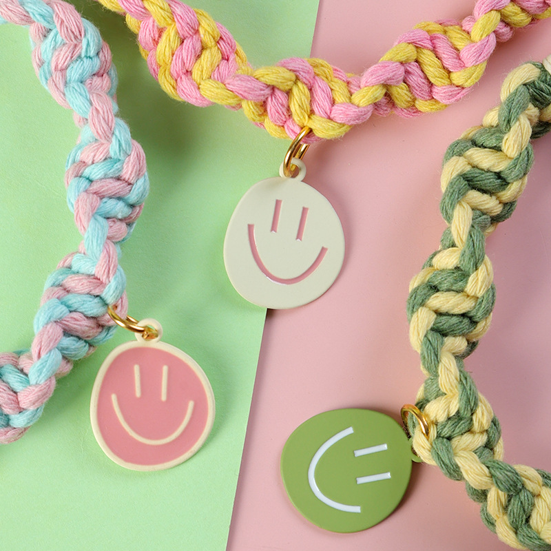 中央には笑顔モチーフやラウンド型のチャームが付いており、お散歩中も愛犬の可愛さを引き立てます。
