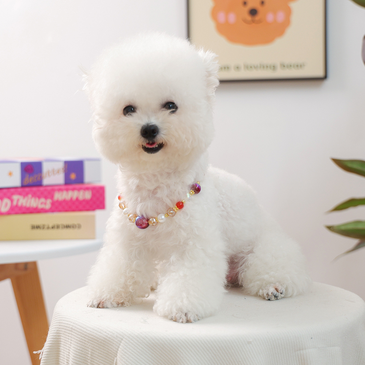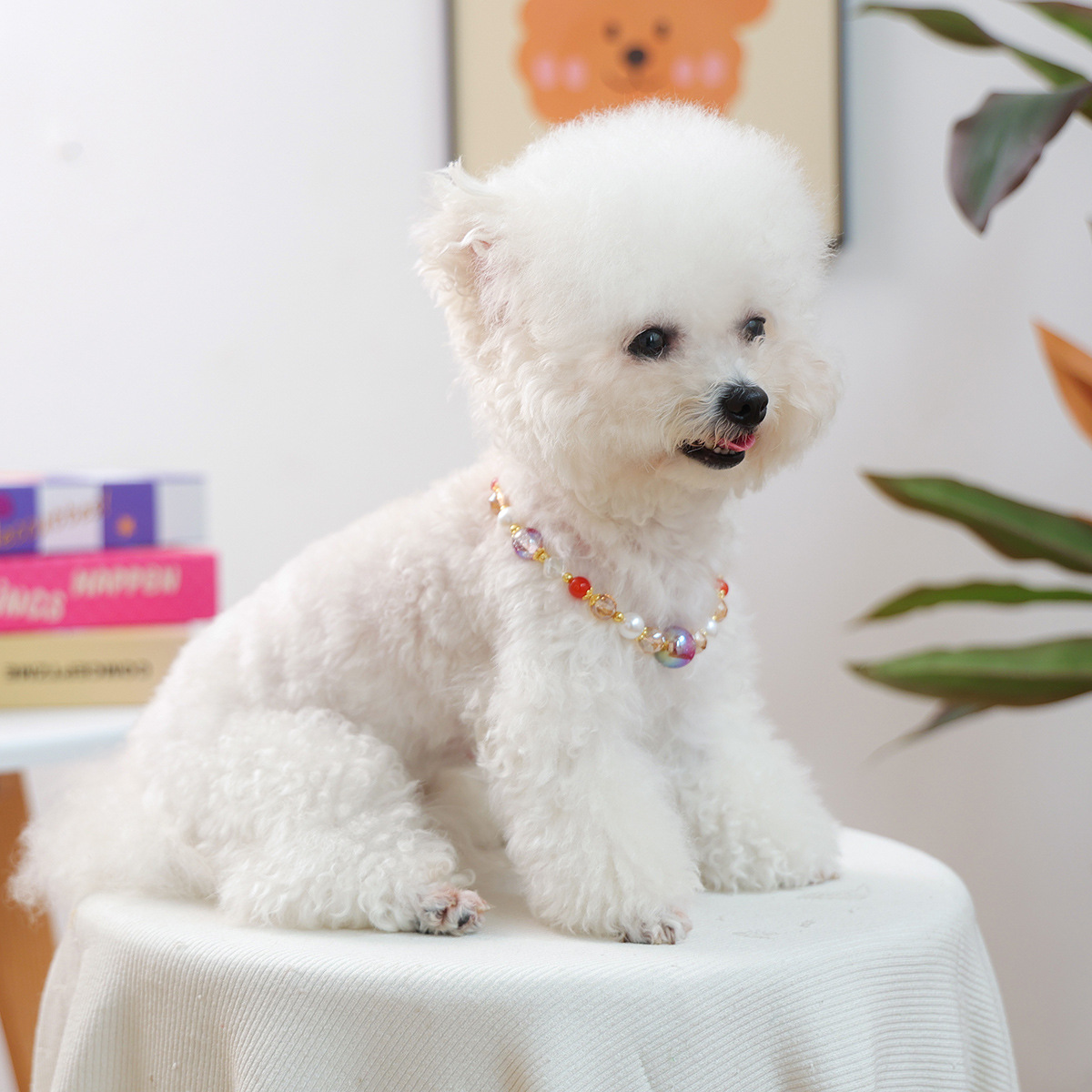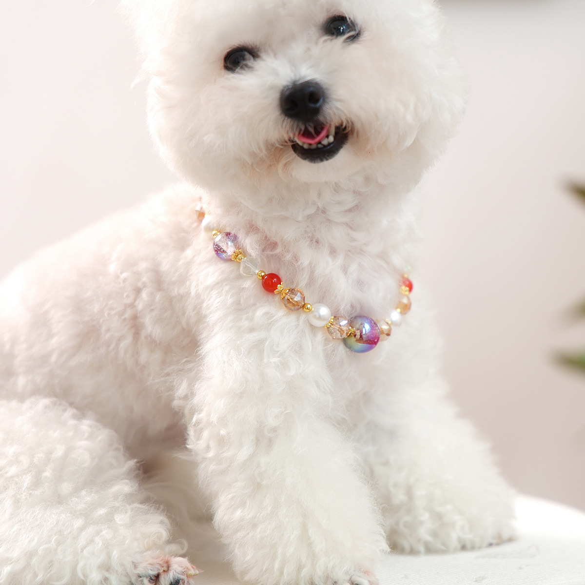 軽量で首に負担をかけにくく、ビーズの優しい輝きが愛犬の可愛らしさを一層引き立てます。