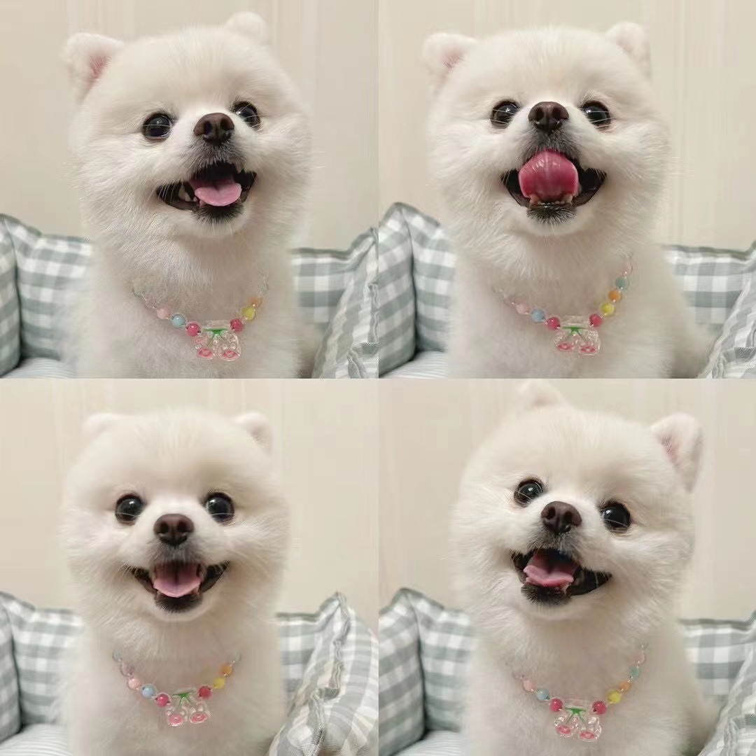 透明なビーズの中に色とりどりの玉が入った、とても軽い犬首輪です。