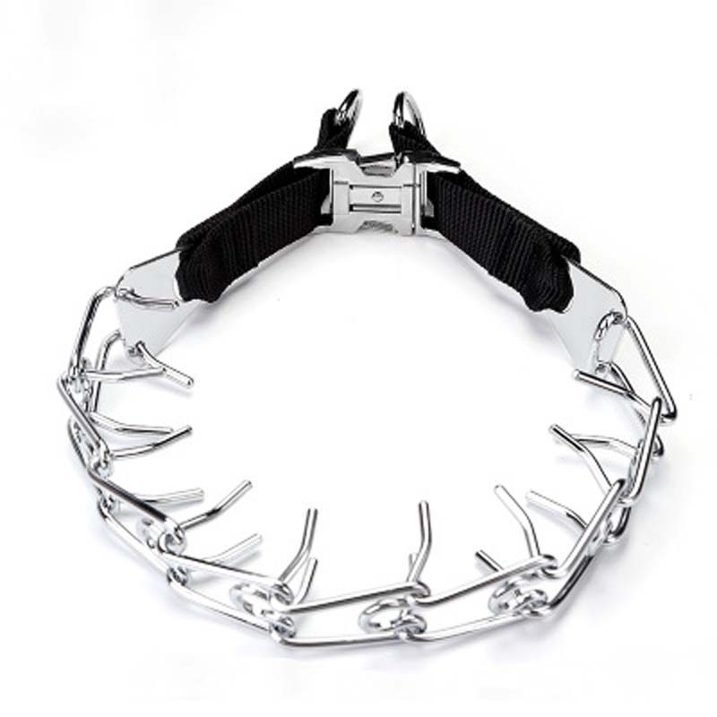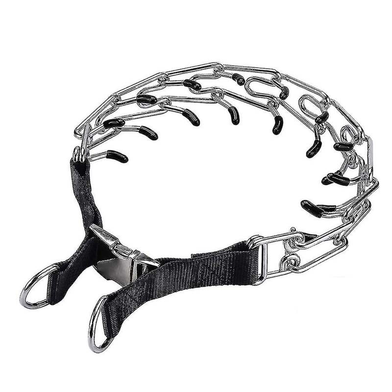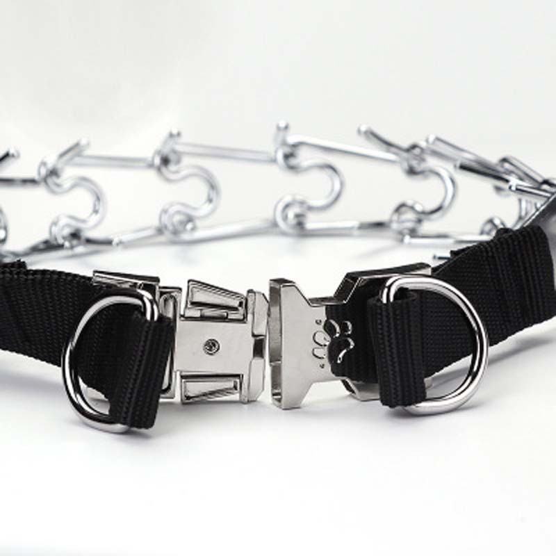 丈夫な金属製チェーンと調節可能なナイロンベルトを組み合わせた構造で、中型犬から大型犬まで幅広く対応します。
