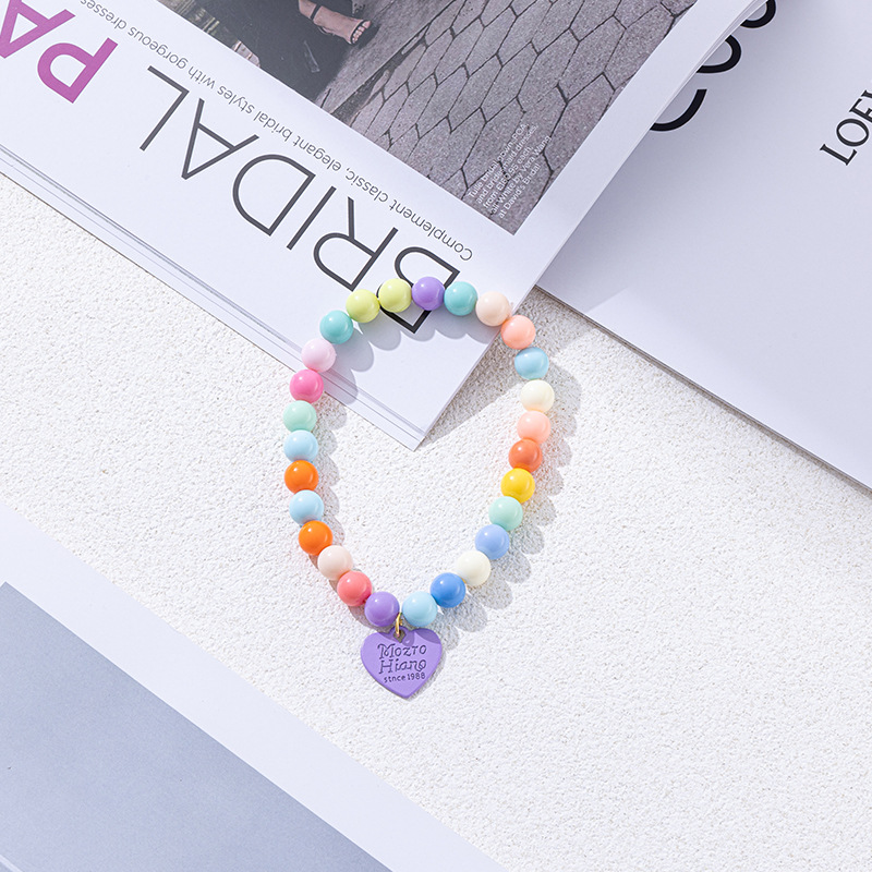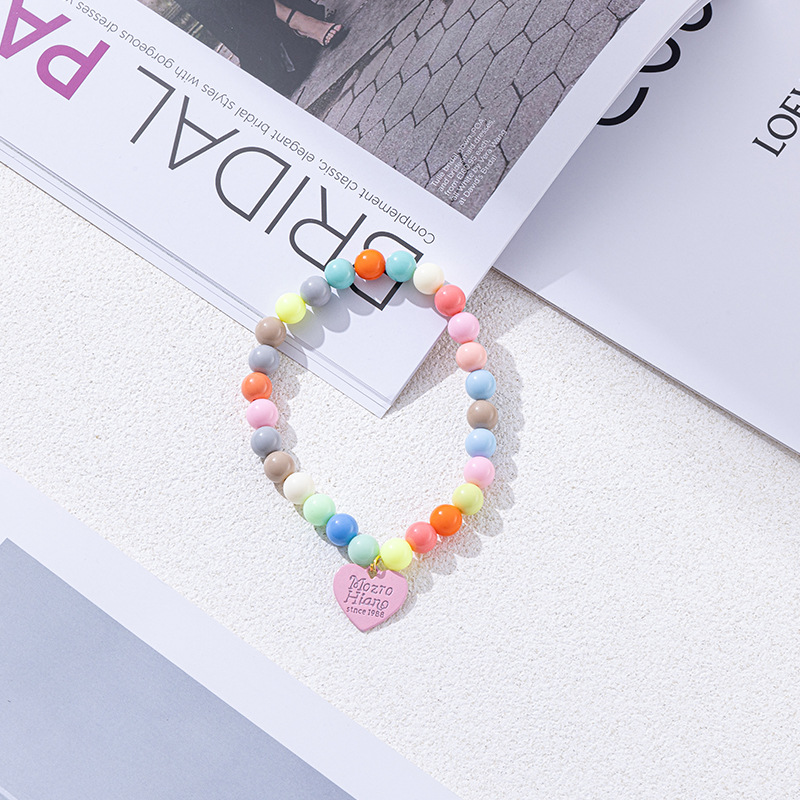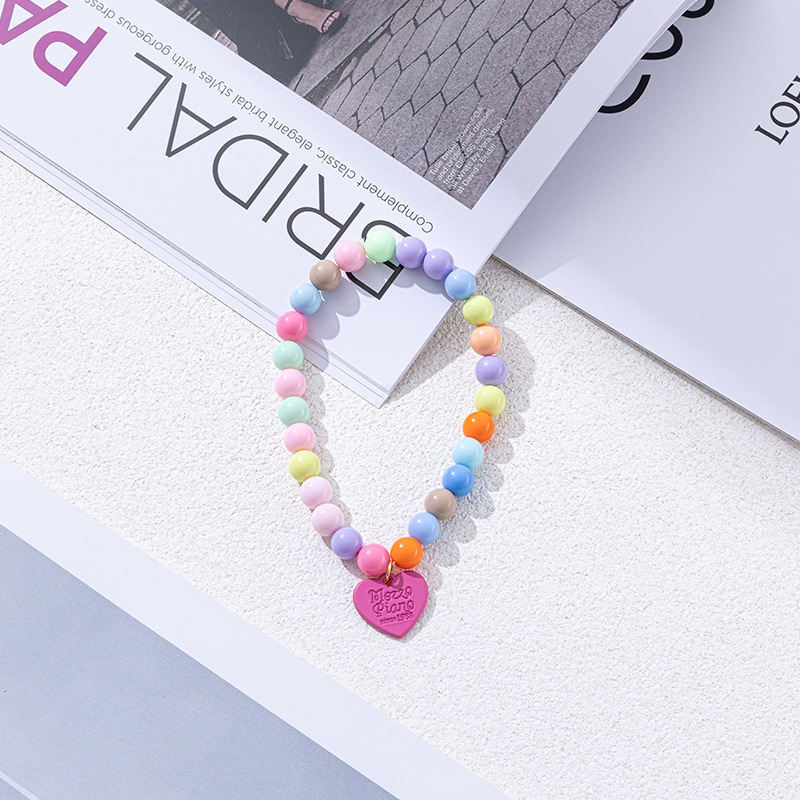 丸いビーズを連ねたデザインに、ハート型のチャームがアクセントとして付いています。