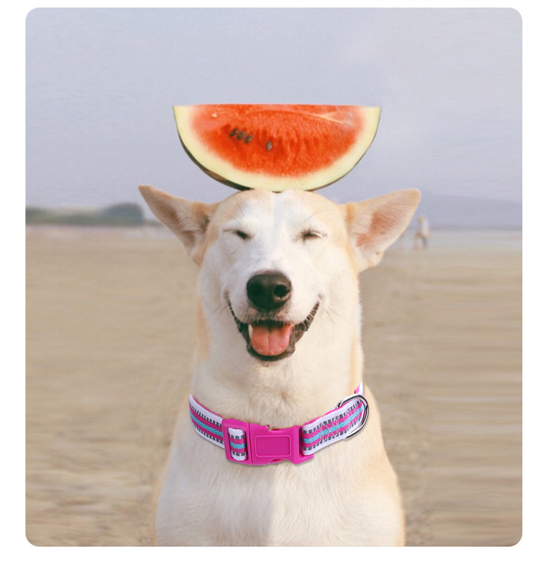 丈夫な太めのベルトに鮮やかなストライプ柄をあしらった犬首輪です。