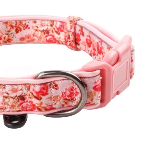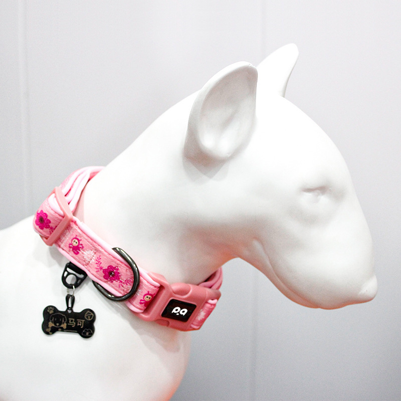愛犬の首元を華やかに彩る花柄刺繍が施された太めの犬首輪です。