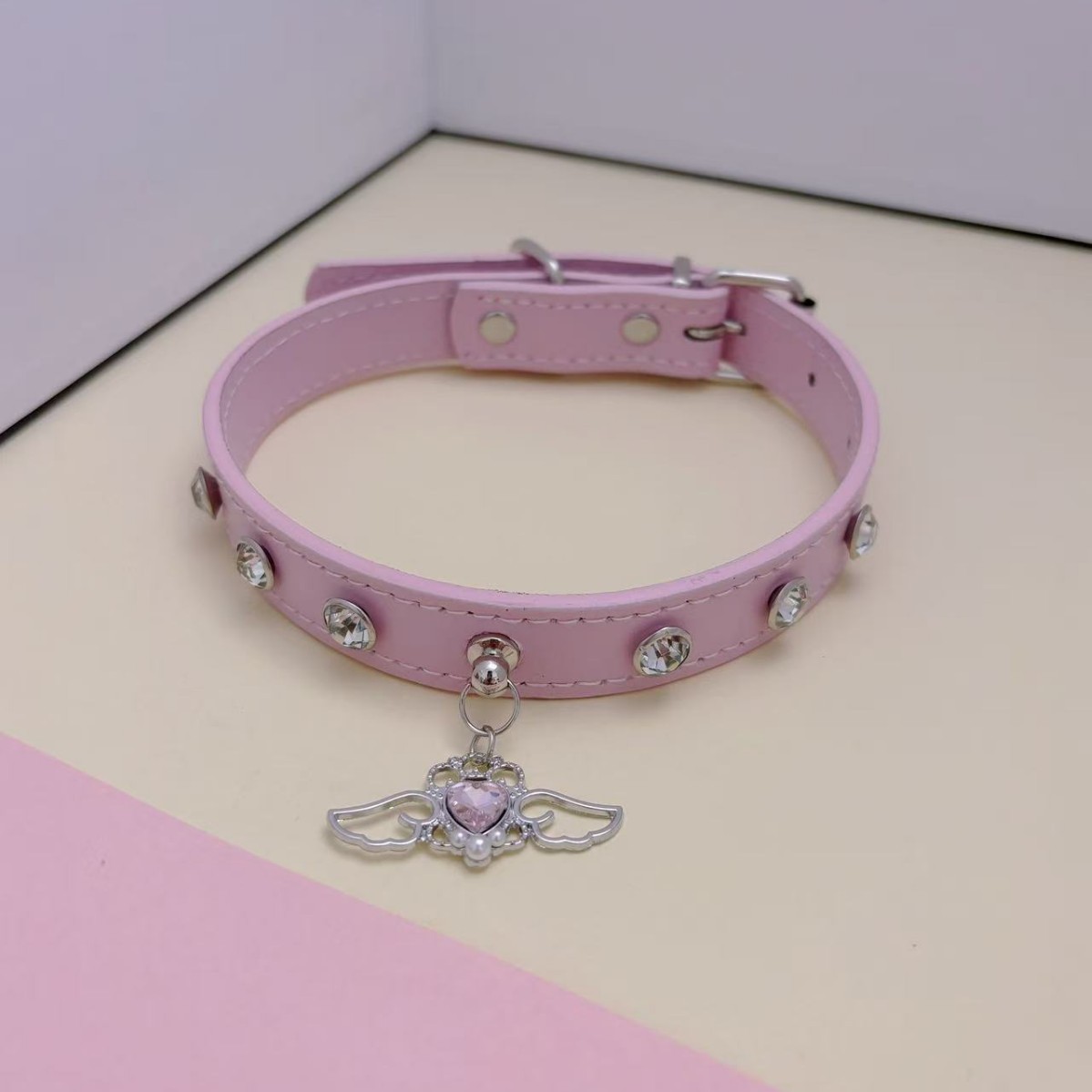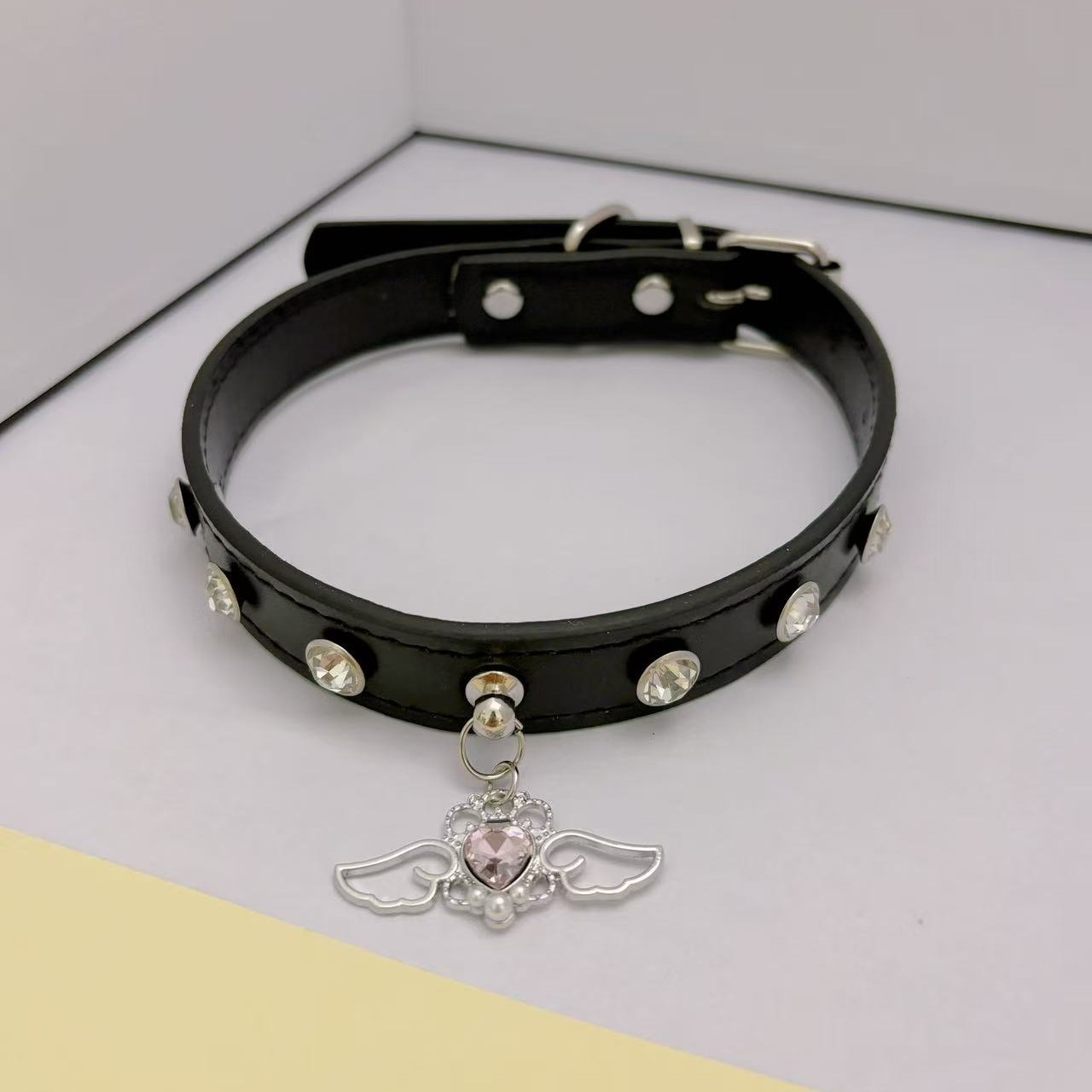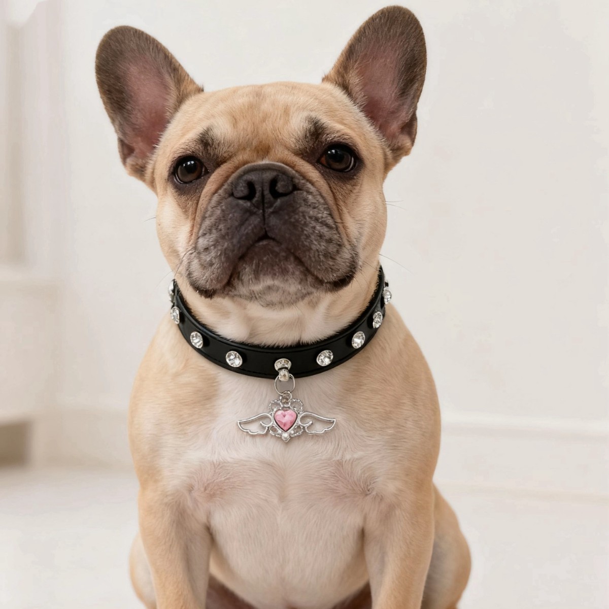 中央には天使の羽根が広がるハートモチーフのチャームが揺れて、愛犬を可愛らしく演出します。