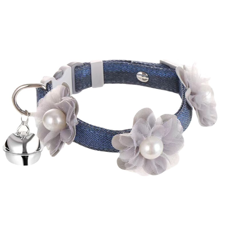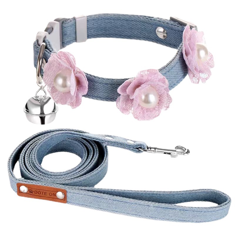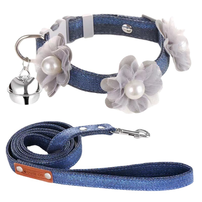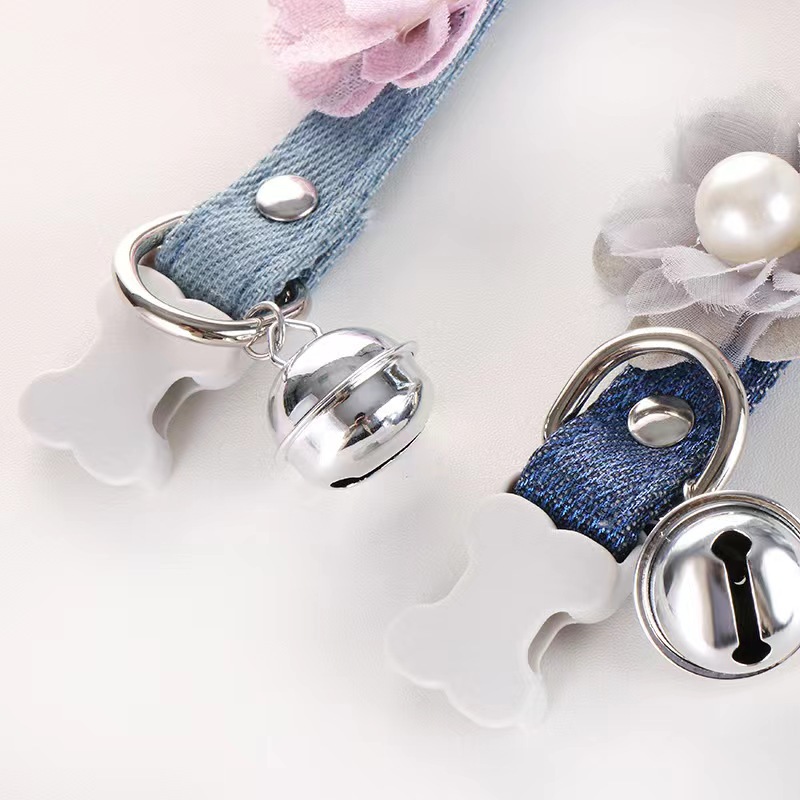 デニム調の生地にチャーム付きの鈴が揺れる華やかなデザインで、お散歩時間を楽しく演出します。