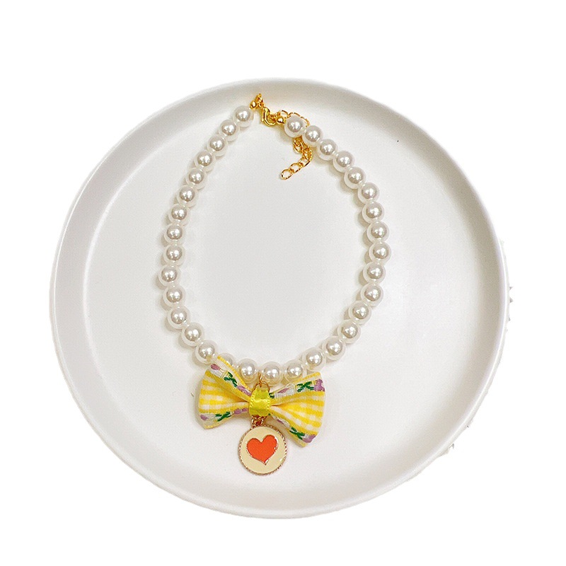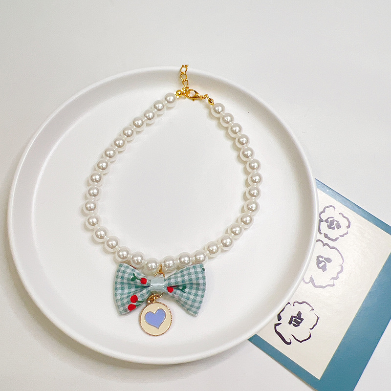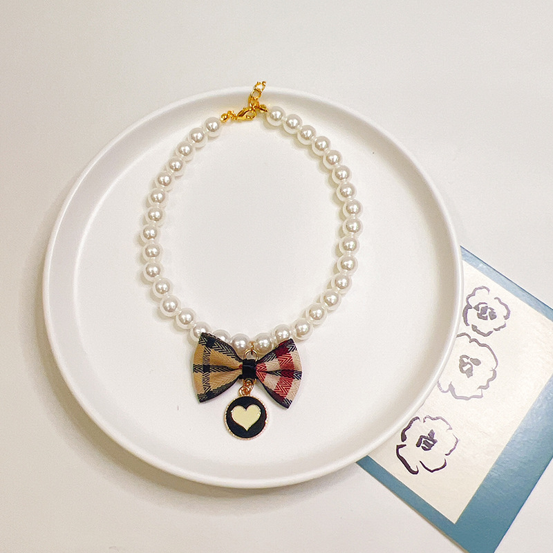 上品なパール風のチェーンに可愛らしいリボンとハート型チャームが付いた犬首輪です。