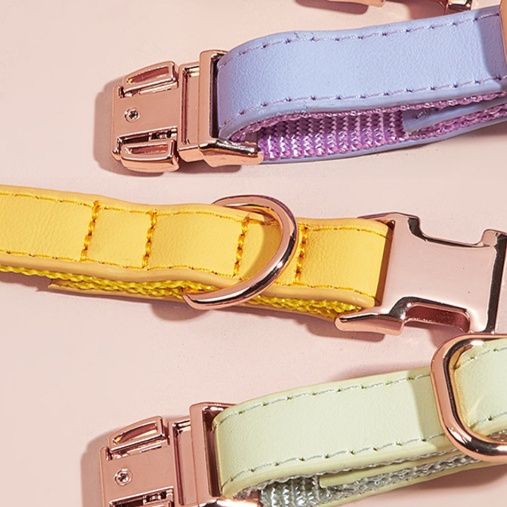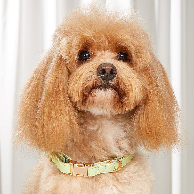 丁寧なステッチワークと金属製のバックルが特徴的で、愛犬の首元を上品に演出します。