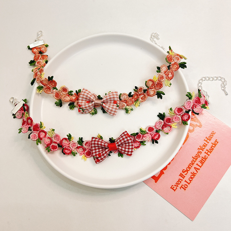 可愛らしい花柄の刺繍とギンガムチェック柄のリボンがアクセントになった犬首輪です。