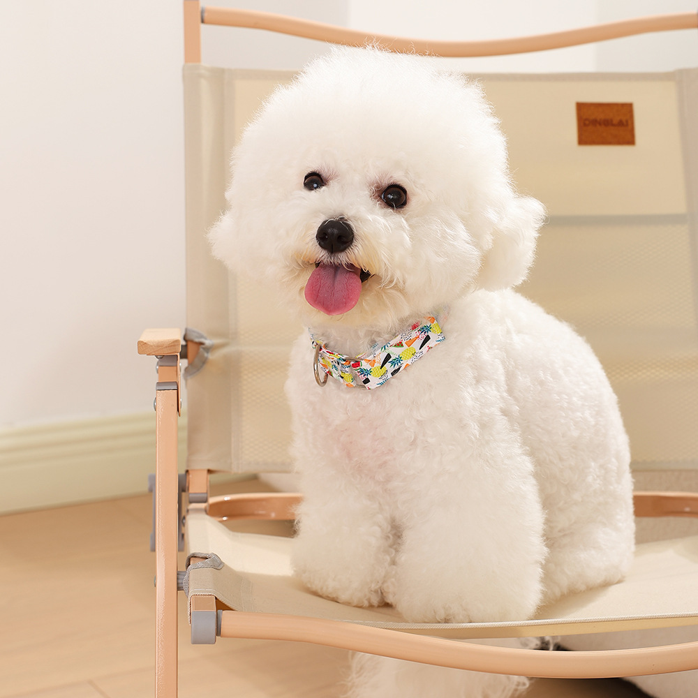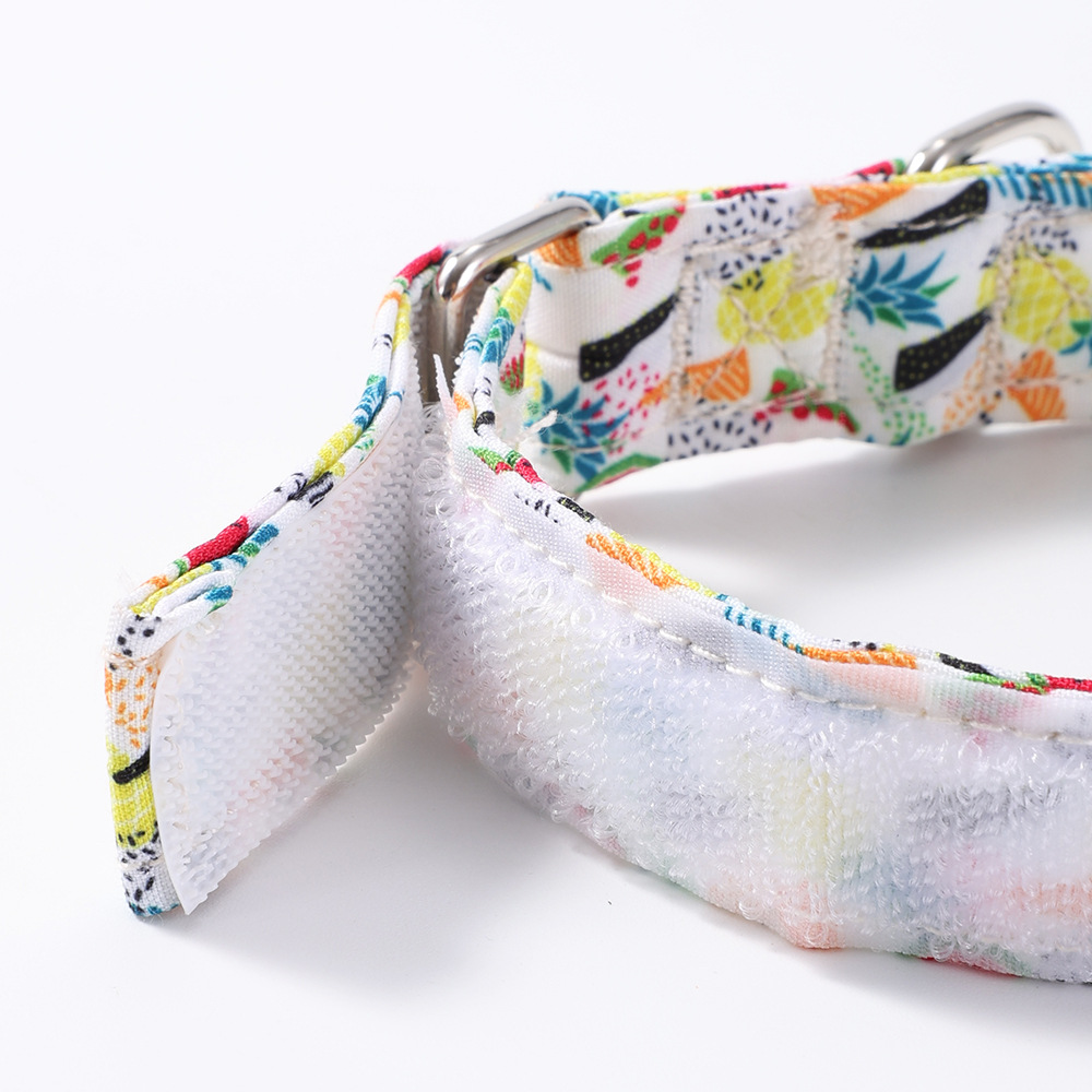 チェーンタイプの首輪に色鮮やかなパイナップルや植物の模様をあしらい、お散歩が楽しくなるデザインに仕上げました。
